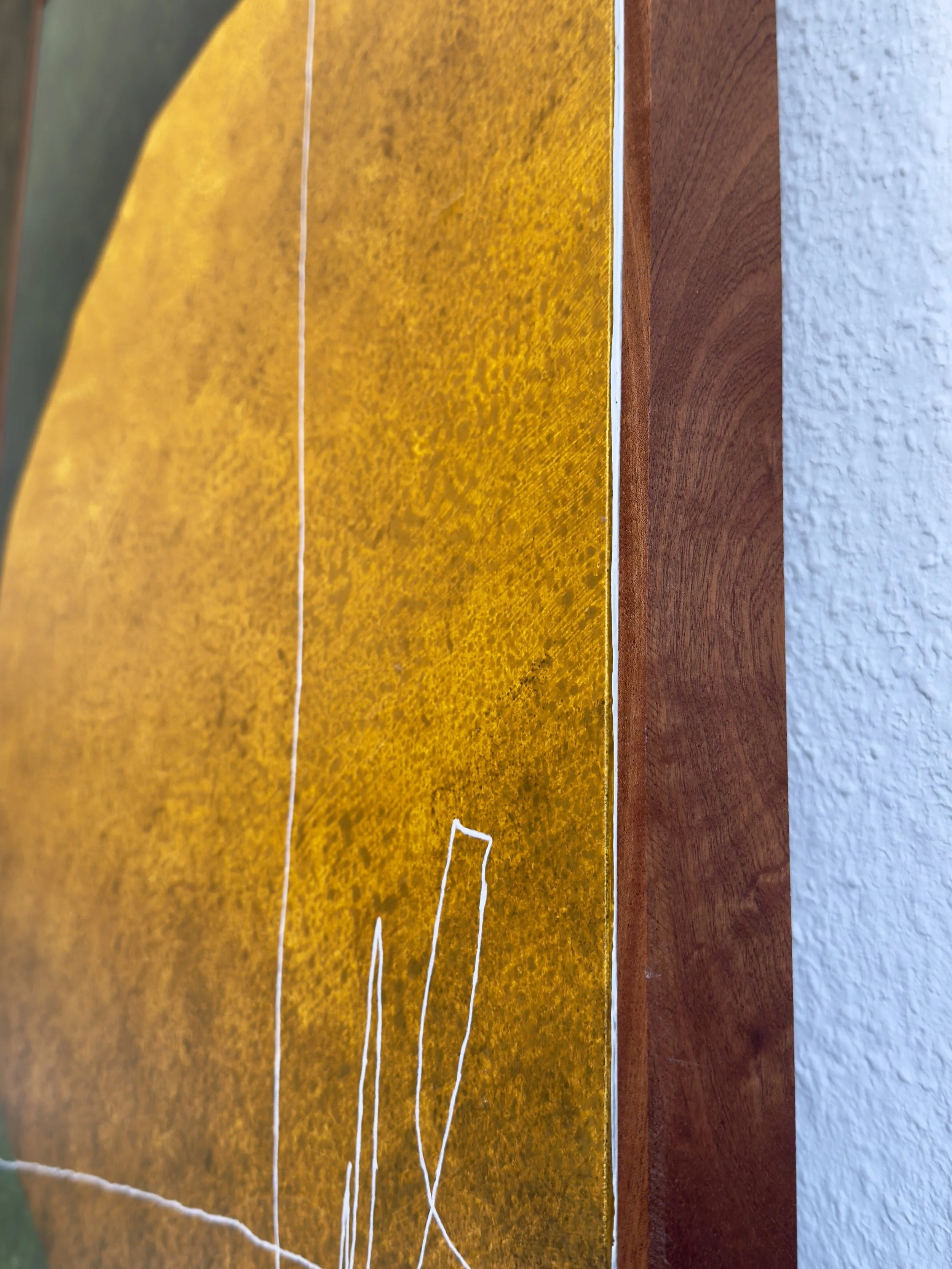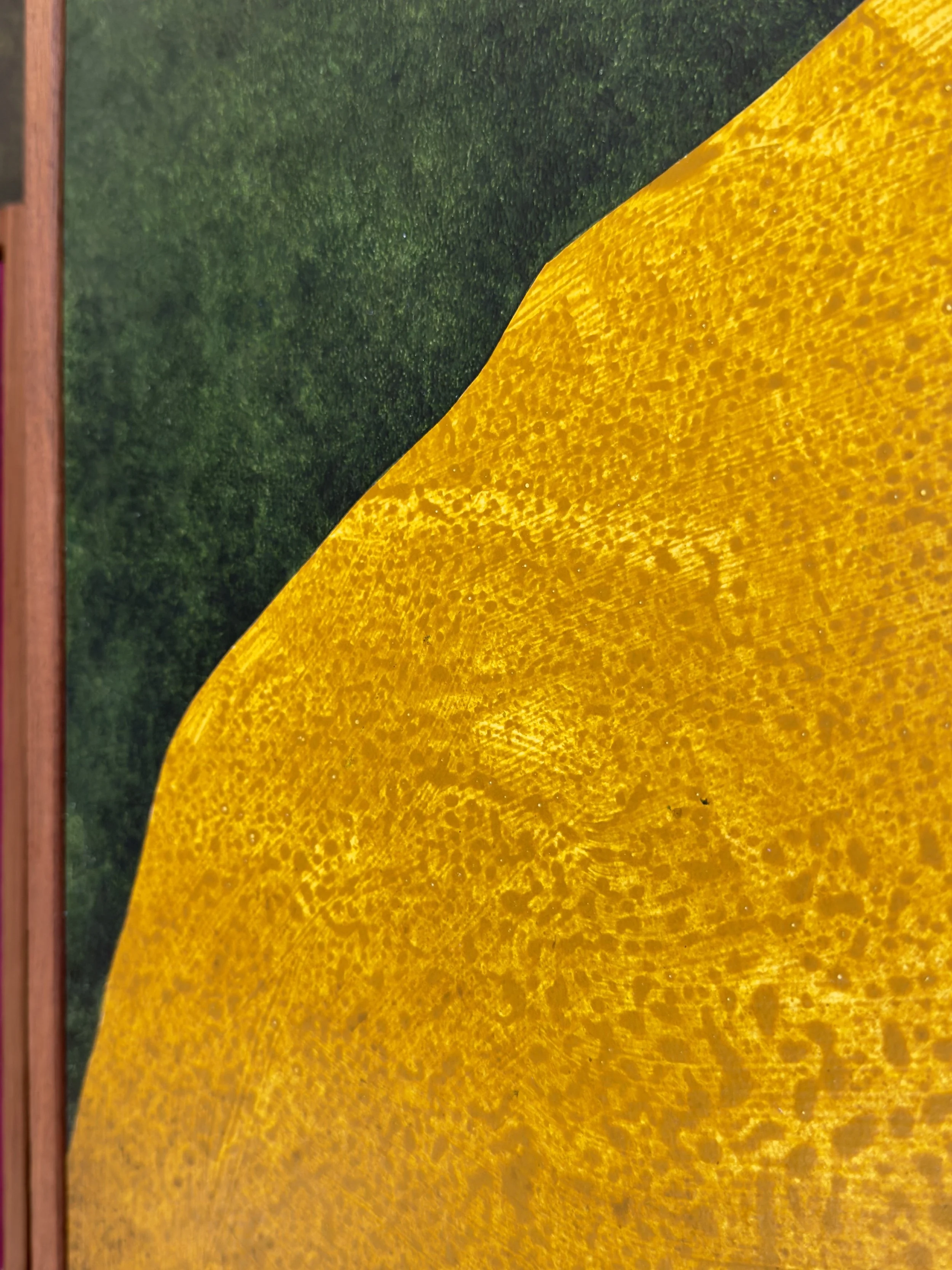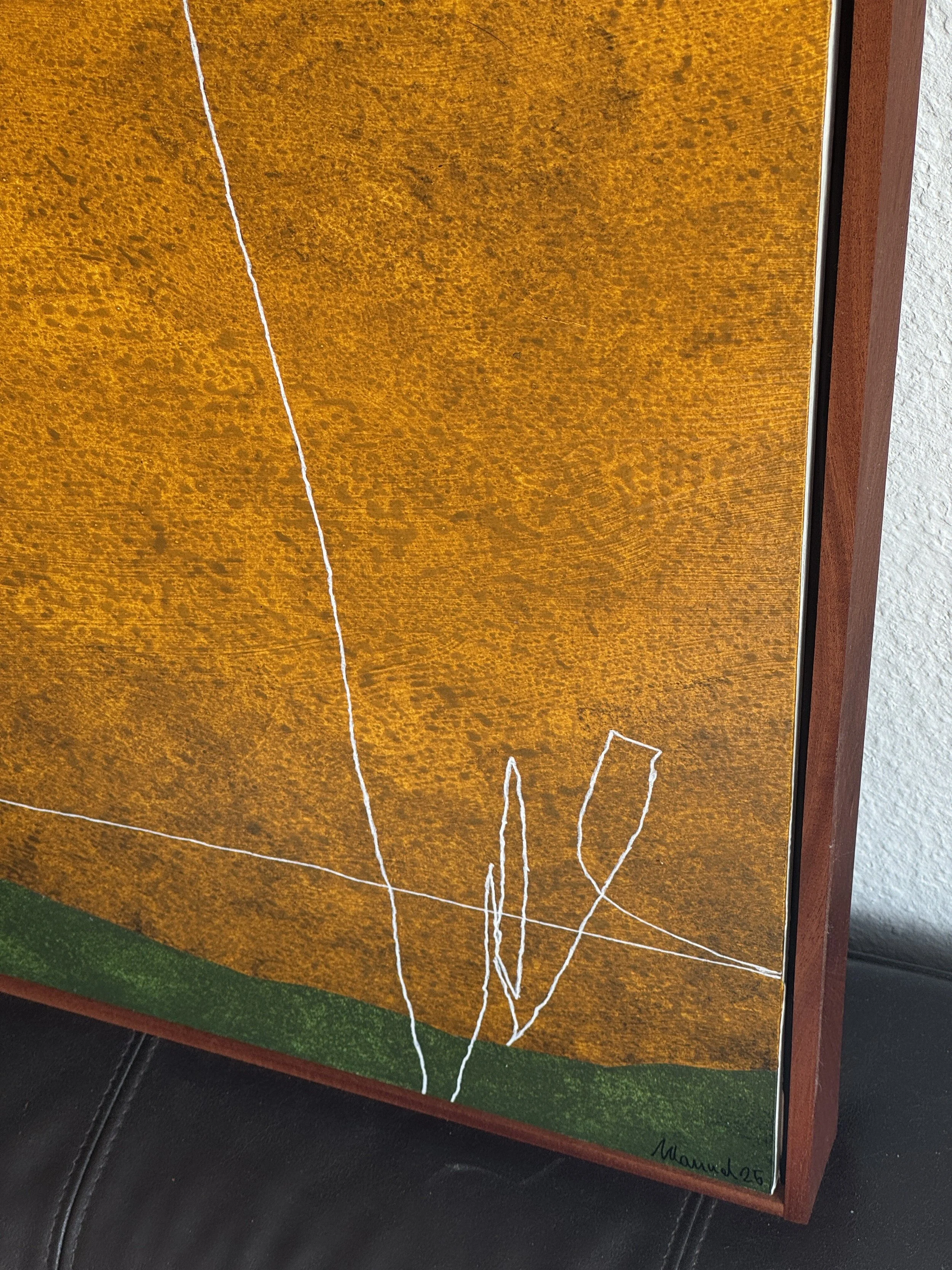 Hinweis: Auf den Fotos kann der Schutzfirnis Licht reflektieren, wodurch insbesondere dunklere Bereiche schwer einzufangen sind. In der Realität wirkt die Oberfläche ruhiger und ohne störende Spiegelungen. Bitte beachte, dass die Farben des Gemäldes je nach Bildschirmdarstellung leicht abweichen können.