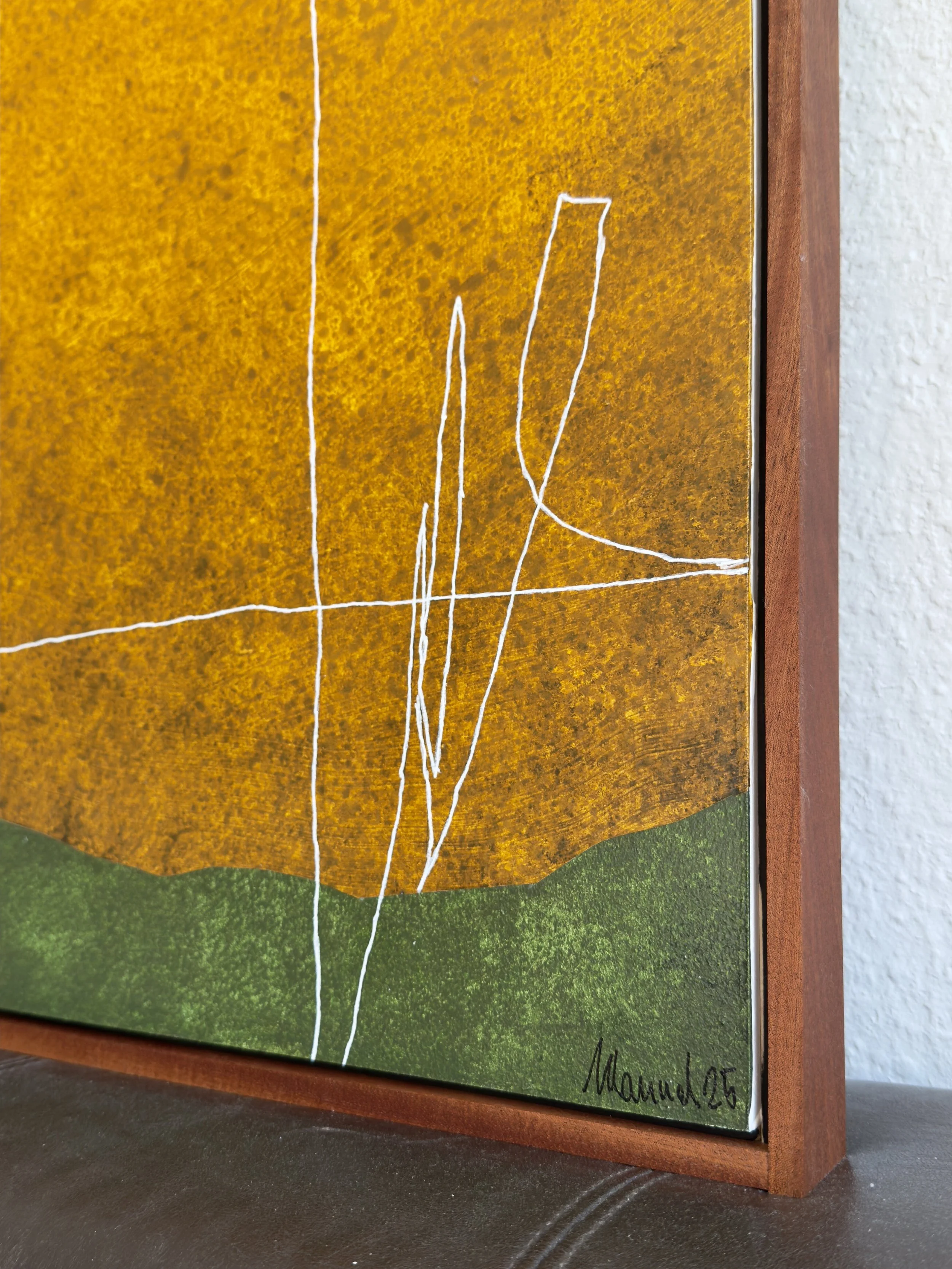 Das fünfte Werk meiner Serie Patatas. Zunächst ohne klare Absicht entstanden, doch im Prozess kristallisierte sich eine unausweichliche Assoziation heraus: Kartoffeln. Die Linien durchbrechen das Geordnete, wie ein bewusstes Gekritzel über eine fertige Fläche. Genau dieser scheinbare Regelbruch schenkt dem Bild seine Energie, seine Bewegung und seine Eigenwilligkeit.